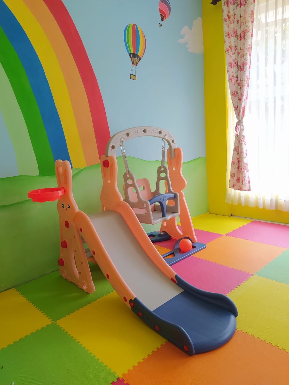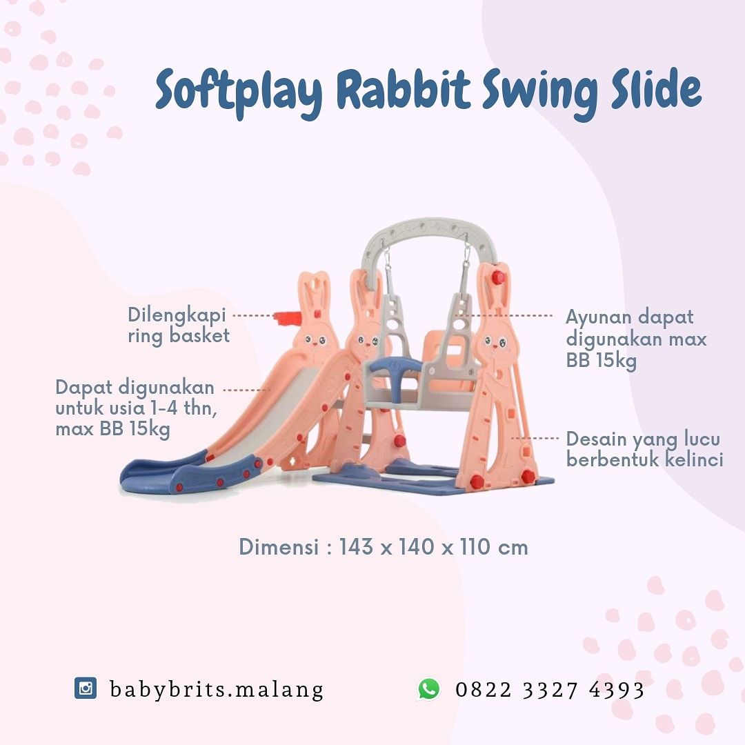 Mainan perusutan anak yang dilengkapi ayunan dan ring basket. Desain yang lucu berbentuk kelinci.