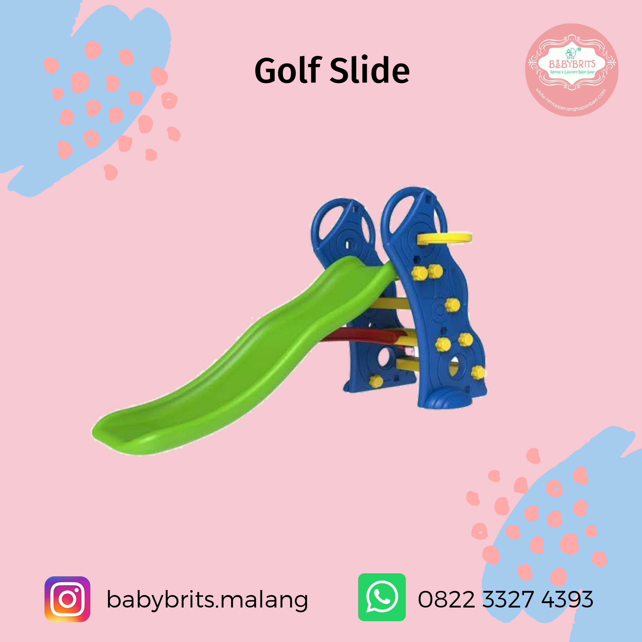 Golf slide hadir untuk menemani aktifitas bermain anak anda dengan fitur 3 anak tangga yang aman dan basket ball dan perosotan yang panjang, sudah tentu buah hati anda akan puas bermain seharian bersama perosotan golf slide ini